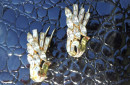 This is a pair of exquisite fur pins by Coro. Features large clear marquise and baguette rhinestones set in gold plated metal with dual pin back. There is solid quality construction and a good weight to each pin. In excellent near mint vintage condition. Signed on the back Coro Craft. Date of manufacture is estimated at early 1940’s by A. Katz.