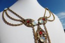 High quality vintage long necklace with an amazing collar chest plate piece, with draped gold plated chains and faux opals and rubies.  Comes giftboxed ready for a goddess.